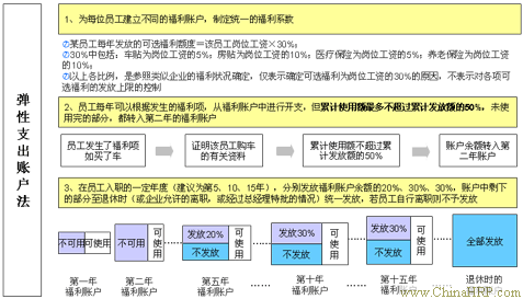 通过这一步的操作,在实现了员工保障的基础上,又确保了每个员工的福利账户在经过了若干年的运作后,能积累大量的福利资金。如果不是正常退休,或经过企业允许而中途离职的员工,就不能拿到弹性福利账户中剩余的福利款项,从而起到一定的“留人”作用。