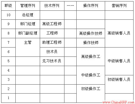 职业生涯管理不是独立的,是与人力资源管理的其他模块息息相关的。首先设计员工职业发展通道,画好蓝图。考虑工作内容的侧重点以及薪酬福利组成等,我们将企业员工分成不同的序列,分为管理序列、技术序列、操作序列和营销序列等,再根据岗位价值评估结果,确定每个序列职级的位置。