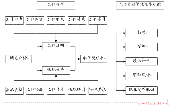 那么为什么说工作分析是人力资源管理的基础呢?工作分析和人力资源管理的主要职能密切相关,如上图所示。概括起来,包括以下几个方面: