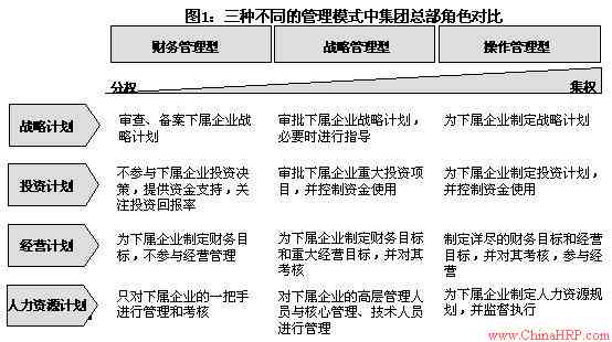 按照集分权的程度,集团公司总部对下属企业的管理模式可以分为三大类:财务型、战略型和操作型。集团总部对下属企业的控制,最主要是体现在以下四个计划的控制:战略计划、投资计划、经营运作计划和人力资源计划。上述三大类的管理模式在四大计划控制中体现出不同的集分权程度。