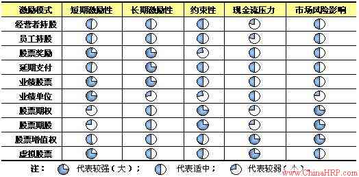评价一个激励模式的特点,主要从短期激励性、长期激励性、约束性、现金流压力和市场风险影响五个方面去考察。短期激励性指受益人能否在短期内获得激励计划带来的收益;长期激励性指受益人对较长一段时间后能否从激励计划获得收益的预期;约束性针对企业和个人双方,一方面指受益人是否会因为自己的错误行为减少收益,另一方面指企业是否对受益人的错误行为采取惩罚措施;现金流压力指在实施激励计划时企业出资的程度;市场风险影响是指股票市场价格的变动对企业实施激励机制产生的影响。研究对十种激励模式的特点进行了评估,结果如图2。