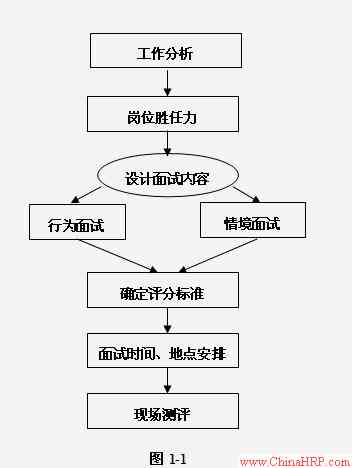 例如图1-1,是结构化面试的组织实施程序图,通过对整体流程的分析,保证考官在实践中能够按照心理测量的专业标准和指导方针来实施结构化面试,并对结构化面试各个环节的内容以及注意事项先有个理性的认识。