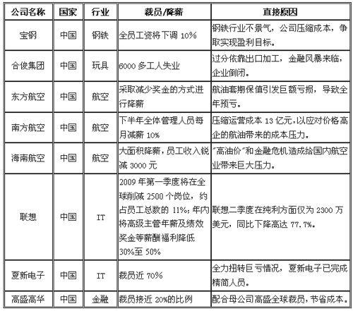 这样的企业生存状态迫使大部分现存的企业纷纷采取裁员或者降薪的行动。大型国企如宝钢都在酝酿降薪,全员工资将下调10%;玩具大王合俊集团,一夜之间破产倒闭,造成6000多人失业;天之骄子东航、南航、海航纷纷大幅降薪;民族品牌联想集团也开始全球大裁员;民企明星波导、夏新被迫削减人力成本……降薪裁员已波及房地产、航空、石化、电力、IT、证券、金融、印刷等一系列行业。