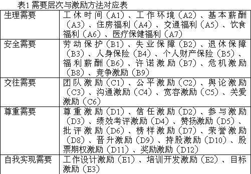 根据马斯洛需要层次理论,人的需要有从低到高五个层次,即生理需要、安全需要、交往需要、尊重需要和自我实现需要。宋联可(2003)根据前人文献,对需要层次理论与激励方法做过深入研究,寻求二者之间的对应关系。但是,一种激励方法往往可以同时满足一种或几种需要,因此,这种对应关系也非严格的对应,仅是说明该激励方法主要满足哪种需要。