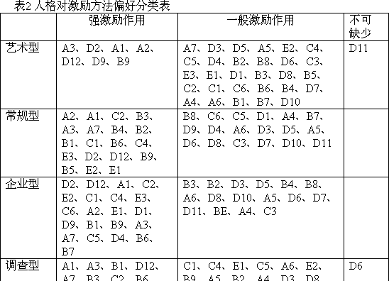 为了研究不同人格类型的员工对各种激励方法的反应,宋联可在2002年进行实证研究,发放问卷150份,回收有效问卷134份。调查将人们对激励方法的态度分为五类,即强激励作用、一般激励作用、不可缺少、可有可无、消极作用五种态度。结果表明,没有人选“可有可无”和“消极作用”,说明调查选用的激励方法都具有较好的激励作用。各类人格对每种激励方法的偏好程度列于表2,激励方法按所得分值从高到低排列。