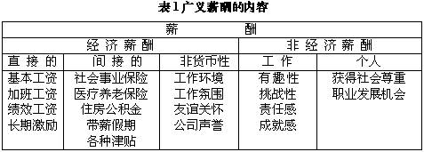 传统的薪酬理论只对经济性薪酬感兴趣,但随着薪酬理论与管理实践的不断互动与发展,薪酬的内涵和外延发生了很大的变化。薪酬有狭义与广义之分。狭义薪酬是指个人获得以工资、奖金以及实物形式支付的劳动回报。广义薪酬,是指员工因完成工作而得到的所有的奖励,是由经济薪酬与非经济薪酬两个部分组成的劳动回报。它不但包括直接的货币形式(直接薪酬)和可转化为货币的其他形式(间接薪酬),还包括较舒适的办公环境、组织内部的良好人际关系以及较多地参与决策、工作的挑战性与成就感和较好的发展机会等难以用货币来衡量的薪酬形式。广义薪酬的内容见表1。