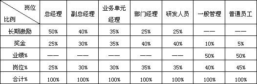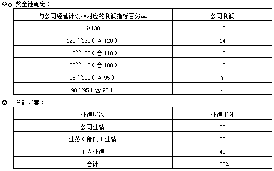 奖金——奖金可以是贡献奖金、年度奖金,也可以是长期性的,如股份期权等。此部分薪酬确定与公司的年度经营目标与利润相关;纳入薪酬总量进行财务核算,依据公司市场及经营状况,确定其占薪酬总额的比例。见奖金池比例设置。