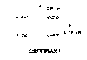 这里我们首先做一个假设,即员工对企业的价值贡献,取决于其所处的岗位的价值以及他相对此岗位的匹配度。以此我们把企业中的员工分为四类: