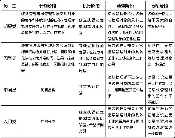 通过绩效管理激励或驱动员工的行为,或称为微观绩效管理,一般也可以按照PDCA的方法将其过程划分为四个阶段“计划(设立目标和标准)—执行(绩效管理对象根据目标和计划工作)—检查(绩效管理者对绩效管理对象执行过程的控制和辅导)—行动(考核、总结、回报、螺旋上升)”。根据员工在企业中所处的岗位以及其岗位匹配度的不同,绩效管理者应该采用不同的绩效管理策略(在这里,我们认为,绩效管理者即绩效管理主体是企业中所有的直线经理和高层领导者),具体体现在为: