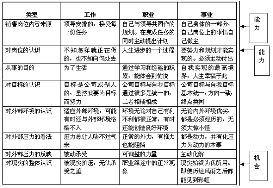 所以,现在大量存在的“营销人如何突破外界(职业环境)限制?—面对业绩压力、公司管理压力、公司‘职业规划’等外界限制因素,营销人怎样排除阻力,发现机会,突破常规轨迹。”的问题,主要集中在大家对“工作、职业、事业”的认识模糊,没有澄清这些重要概念以及了解其中内涵。有了这些概念的突破,就能为困惑找到一定的解决方向。