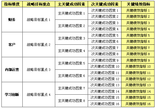 通过平衡计分卡,我们就可以从四个维度明晰企业的战略目标重点,如财务维度方面:快速扩大销售规模,提高销售收入,客户维度方面:显著提高产品品牌,扩大市场占有率,内部运营维度方面:导入信息化平台管理,改善销售模式,学习与成长维度方面:加强骨干员工的培训,打造学习型团队,等等。