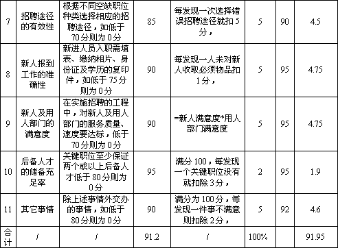 在该考核表的评语部分,人事经理针对未达标项目写道:张三在上个考核期间有三项指标没有,其中《招聘人员到位率为97.8%,《推荐人员合格率》为94.5%,《笔试题目的有效性》为94.1%,其原因在于张三对公司生产流程不很熟悉,不完全了解各岗位相关的要求,致使无法充分判断笔试题目的有效性和推荐合适的人员到用人部门,在下个考核期间安排到各个部门做培训,以大概理解各岗位要求和核心生产流程。