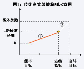 如图所示,传统方法中,高管实际所得绩效薪酬以是否完成业绩目标为标准分为两段。段绩效薪酬通常以1倍绩效薪酬为基准计算,段通常以销售额、利润额、净利润等为基准计算奖金。而且,一般情况下,企业为强化激励,后者的奖励幅度要比前者大许多。