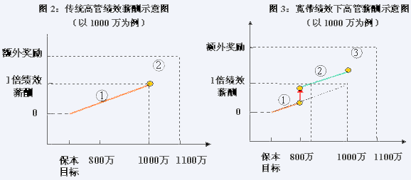 从图2和图3,我们可以清楚看到,高管在宽带绩效下,与传统方法不同的是,当高管的年度业绩达到800万时,其绩效薪酬有一个跳跃,基本靠近1倍绩效薪酬;而当高管完成1000万指标时,事实上高管实际所得绩效薪酬已超过1倍绩效薪酬,并且完成的业绩指标在800-1000万之间时,绩效薪酬的增加是平缓的。我们可以这么来看:在这个案例里,800万事实上才是被企业和高管都认可的正常年度业绩指标,一旦完成800万,企业基本目标便完成了,高管绩效薪酬也可拿到了,超过800万的部分,属于企业担心业绩的非正常增长设定的。