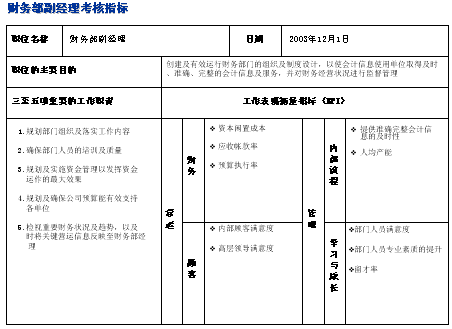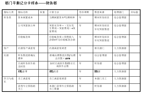 部门的考核指标来源于三个方面:一是公司平衡记分卡分解的关键业绩指标和关键目标;二是内部客户的期望:为实现公司的平衡记分卡,从其他部门的主要需求与期望出发设计目标·部门目标:三是为实现公司平衡记分卡设立的部门目标。