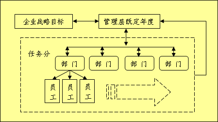 绩效考核的形成和目标的设定源自于企业的战略目标,企业管理层每年对企业下一年度或者一段时间内的任务进行精心的设计和制定,然后分解到每个部门中去,经过上下级之间的沟通,产生企业既定的年度目标和计划,然后再次分解,层层沟通,将任务分解到部门级以下的若干个层面中去,企业的管理目标和经营目标就得以落实,各层员工为企业共同的目标努力。