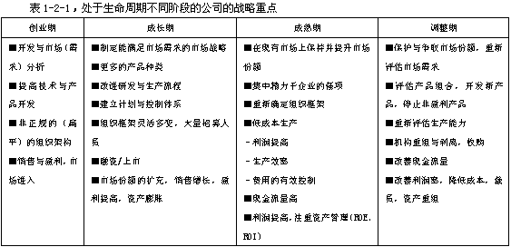 公司战略的制定这不是本书所要解决的问题,不予讨论,但是要明白公司在生命周期不同的阶段有不同的战略重点,如表1-2-1。