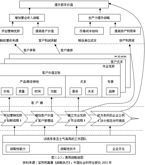 战略地图就是企业需要交流战略与实施战略的过程和系统。战略地图的绘制就是从战略出发找出能够到达目标的路线的过程。如图1-2-5。