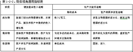资产利用和投资战略的财务关注点在于资金周转(应收帐款、库存、应付帐款)、提高资金利用率,尽早实现现金回报。财务视角通用指标见表1-2-2。