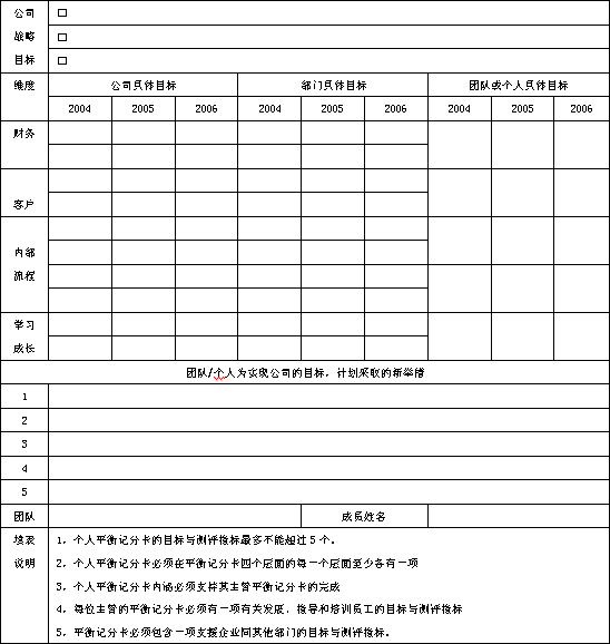 按照设计部门BSC同样的原理与程序设计个人的BSC。如表1-2-7示,个人平衡记分卡包含三个不同层级的衡量信息,从而使得所有员工在日常工作中,能轻易看到这些战略目标、测评指标和行动计划。