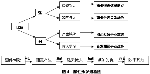 人都有一种比较的心理(比较心里如图4),嫉妒源于比较,康德认为嫉妒是忍着痛苦去看别人幸福的一种倾向,是一种间接的、怀有恶意的想法,也就是说是一种不满(康德,1957)。中国宋朝名相王安石认为:嫉生于不胜。辞典里嫉的意思是憎恨比自己好的人,妒则是埋没贤良的人。在圣经中嫉妒被称为“凶眼”,在占星术中则称之为“灾星”。嫉妒具有对象指向性,即指向特定对象;临近性,即比较对象的年龄、文化、地位、空间距离等临近,一个人可能容忍一位陌生人发迹,却不能容忍身边人有所作为,甚至是好朋友,乞丐一般不会嫉妒皇帝;隐蔽性,一般不会太直接表现;危害性,处理不好会对自己、指向对象及社会产生危害。当然嫉妒也有其正面作用,他可以对个体求胜心理的激发,从而促进个体不断进步。也有利于监视团体公正性,嫉妒可防止领导者过分偏袒某些人。