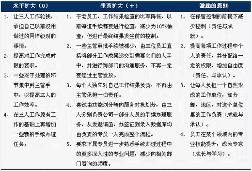 让我们回到第一个故事,看看如何改变才可以使这三位下属在垂直方向上扩大职务范围,并且能够达到激励的效果。这三个人的分工是协助办理这个跨国公司人员在境内外的出入手续:发邀请信、办签证,进行数据库录入。我们用下表来表示水平和垂直方向上的职务扩大方法,在激励的原则里实际上包含了对责任、个人成就、内部承认、成长与学习这些激励因素,加入到新的工作分配方式中,从而对员工绩效产生提升,真正达到了激励与成长的目的。