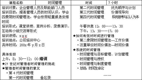 在开展某项培训前,首先需要做出该课程的实施计划,作为整个培训的行动纲领。培训实施计划是年度计划的延伸和细化,年度培训计划确定的是大体的培训课程框架。而实施计划是把课程框架落实为详细具体的实施步骤。实施计划主要内容包括:培训目的、培训课程、培训人员、培训场地、培训讲师、培训形式、培训时间等。当然,计划内容可以根据培训的重要程度适当删减,重要、复杂的培训要求详细具体,不很重要的培训,计划内容可以简单笼统些。