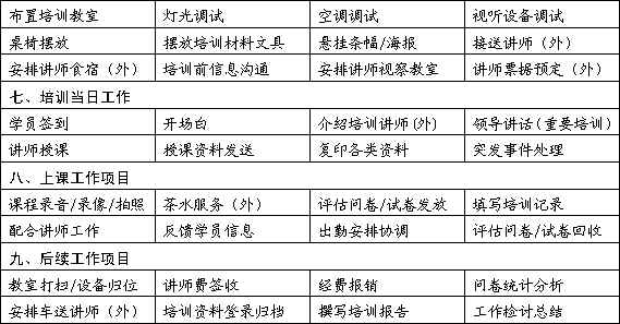 培训后勤服务:后勤服务必不可少,如人员饮食安排、现场录像拍照、现场环境清洁、紧急情况处理等等,这些都需要培训组织者安排解决。