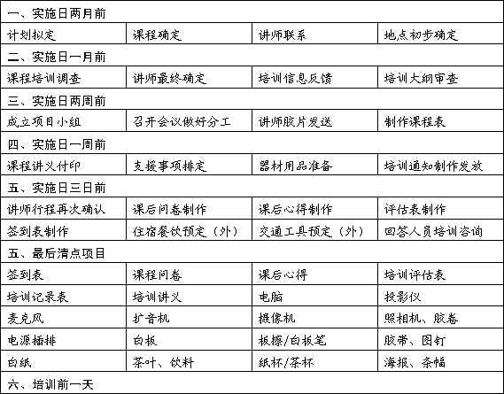 人员确定到位后,需要召开项目小组会,明确各个人员在项目中的工作内容和责任,制定培训实施的倒计时工作计划,对培训所有环节及事项做具体安排,确保每个环节都有专人负责,并做好相应的应急处理准备。