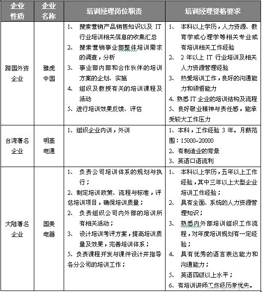 从以上三家企业的用人要求上,可以看出,无论是外资企业还是大陆企业,对培训经理的要求非常全面,既是行业专家、培训讲师,又要兼具课程开发、培训体系建设、培训组织及培训考评重任,甚至还要求英语达到四级的水平。