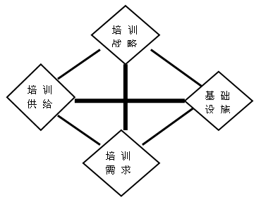 从宏观视角看,影响培训竞争力的要素可以采用钻石模型加以解释(如图1),从图示可见,培训过程实际上是培训供给和培训需求连接的过程。在这种联结的过程中又离不开培训战略的制定和基础设施的配套作用。“钻石”的任何一角的缺失就会影响的整体功效和它的竞争力。培训战略是决定培训供给与培训需求否吻合的宏观行动纲领。基础设施为培训活动的有效完成提供了硬件保证。培训供给必须能满足培训需求。传统培训忽视了“钻石”体的某些棱角,或者说,没有从“顾客”的角度出发思考问题,因而培训质量不高。与之相对照,整体培训既注重培训每一个环节的提升,又关注培训的整体,培训质量和效率大为提高。