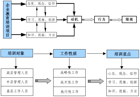 在制定企业年度培训规划的基础上,必须设计出相应的企业培训课程体系。以下是企业培训开发的“动机行为模型”和针对客户企业中不同对象和不同岗位的课程开发模型。