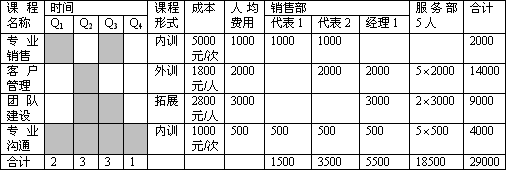 下表是某高科技企业做年度培训规划咨询项目中为其编制的部分课程的预算(非真实,单位:RMB元)。