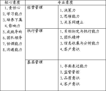 管理者是企业任职资格建立的核心群体,对管理者建立任职资格和专业类技术类的建立过程类似,但对应管理类的“技能”项略有不同,A企业管理类的任职资格包括知识、经验、素质、行为标准。A企业考虑到成本和效果,只对管理类建立了“素质标准”,与专业类/技术类的“技能”项对应。对素质类的建立分为核心素质和专业素质。如下图所示: