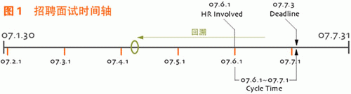 图1中2007年7月3日是部门提出的招聘时间底线,也就是设定了“限时”中的“时”。如果HR是6月1日介入这个招聘面试项目中,那么从2007年6月1日到7月3日就是招聘的时间。招聘人员掐着手指、数着日子、紧紧盯着台历,努力工作着。这种做法就是A公司采用的“点”的理解。