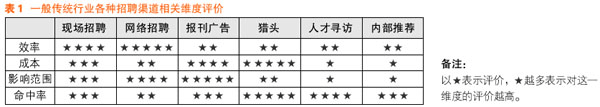 不同招聘渠道,有其各自的优缺点,它们在效率、成本、影响范围、命中率等方面都有所差别(见表1)。