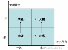 “鸿雁”型:这类知识型员工具备一定的管理意识和技能,相对而言,平时关注管理提升而忽略技术方面的提升,习惯于团队合作而非个人拼搏,逐渐从一名技术人员逐步转变成为一名管理人员。