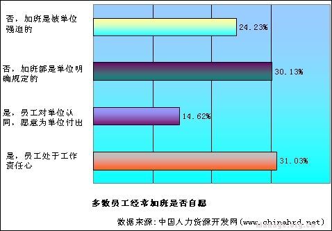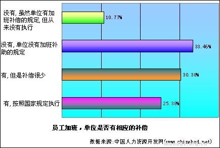 这一点在中国人力资源开发网的调查结果中得到了验证,该调查显示,10.77%的企业虽然有加班补偿的规定,但从来没有执行;33.46%的企业根本就没有加班补偿的规定,员工加班真正沦为“义务加班”。虽然有30.38%的企业表示员工加班有补偿,但补偿很少,和员工的付出不对等。