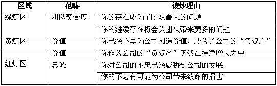 红灯区:高度危险区域,被炒概然率百分之百。进入此区域者,不要再有任何侥幸心理,趁早打包走人,免得两厢难堪。