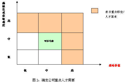 一个有效的重点人才培养运作流程,必须首先决定哪些是公司所最需要的人才。这取决于公司的战略与发展需要。通常用矩阵来解决。根据职位/人才的战略价值和稀缺性或获取难度来区分。如图2。这属于人力资源规划所要解决的问题。