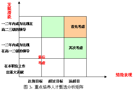 确定了重点人才需要,那接下来的工作就是通过一定的渠道与工具来甄选相应的重点培养人才(对于建立公司素质模型的则采用素质模型测评中心和资格审查的办法)。通常也用矩阵来解决。哪些是公司首先考虑重点培养的、哪些是其次考虑重点培养的,哪些是最后才考虑重点培养的人才,列出次序。根据比例选取重点培养的人选。