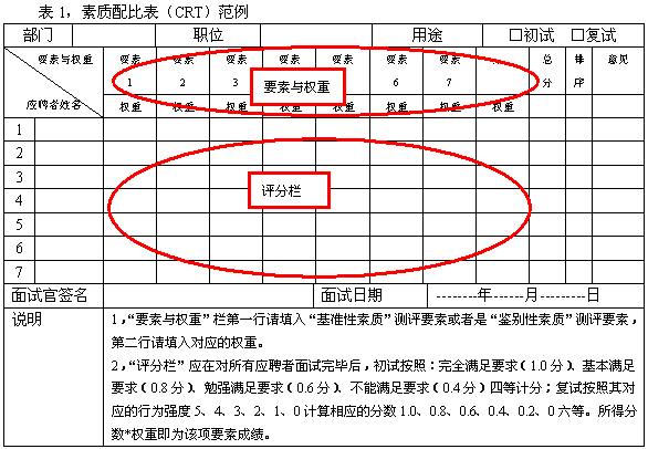 这种工具就是素质配比表(Competency Ration Table,简称“CRT”),如表1,其能让你把精力集中在某一职位的具体要求上,然后根据这些要求对每个应聘者(同一职位初试比例最好为5:1,最多不能超过7:1;复试比例为3:1)进行评估得分,剩下的工作就是选取得分最高的进入复试或者录用。