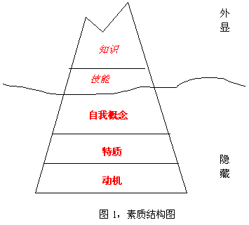 麦克利兰将素质(或胜任特征)分为五个层次,如图1,务种素质被描述成水中飘浮的一座冰山,水上部份代表表层的特征,不能区分绩效优异者与绩效一般者的诸如知识、技能、经验、经历等等,也即从事某项工作起码应具备的素质------《工作说明书》之“入职条件”, 麦克利兰称为“基准性素质”;相对应,水下部份隐藏的自我概念(态度、价值观与自我形象)、特质、动机才是决定人们行为表现的关键因素,也就是真正区别绩效优异者与绩效一般者的“鉴别性因素”。