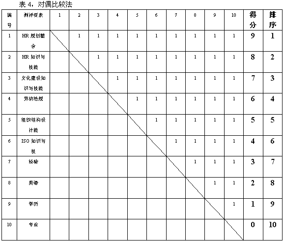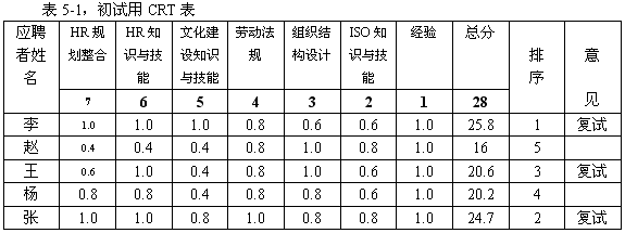 现在你采用对偶比较法确定“入职条件”或“素质模型”各测评要素的重要性排序,如表4,选取排序前7、8位列入CRT表,并配以相应的权重(如表5-1),这样一张初试用的CRT表说做完了;同样你对“素质模型”中各测评要素出进行排序(或者直接参照素质模型各要素的权重),形成复试用CRT表,如表5-2。