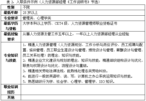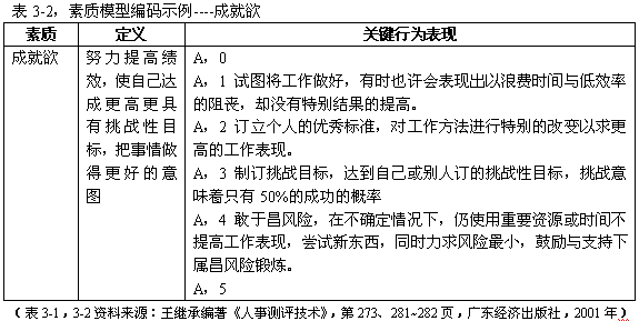 我们知道,通过工作分析,会得到《工作说明书》以及“入职条件”(如表2),通过行为事件访谈法(BEIs)与主题分析得到“素质模型”,如表3-1、3-2