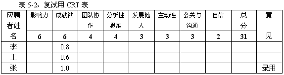 好,现应聘者就坐在你的面前,面试开始了,你每问完一个问题或者针对一个测评要素所设计的一组问题,根据应聘者的言语与体态回答,在你面前的CRT表相应的空格中用铅笔评分(请注意是铅笔)。在面试完所有的应聘者后你才会正式作出评分。要注意的是要一个测评要素、一个测评要素地同时对所有应聘者评分,而不是一个应聘者、一个应聘者地对所有测评要素一次性评分。正式评分完毕,你就可以横向加总得出每个应聘者的最后得分,排序,决定谁进入复试或者是录用。如表5-1、5-2。