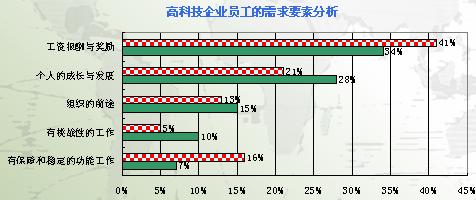 下面看工资报酬与奖励,现实的员工需求,刚才赵博士和封博士已经谈到工资奖励与报酬是高科技企业包括传统企业非常关注的,可能是目前我们对员工收入水平有一个初步的了解,我们现在目前需求程度更多关注于公司报酬与奖励,另外一个方面比较明显的特征,高科技企业的员工与传统企业相比,员工个人成长与发展方面有更高的需求,这是第二个问题。下面关于组织的前途、挑战性工作,包括工作能力、工作保障方面,高科技企业也是有一定的需求。