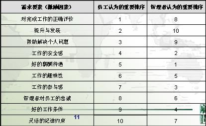 下面是关于员工现实的需求,对我们企业的管理者来说,我们认为他们重要的需求之间的调查。首先一个明显的发现,员工排前三位的,对员工工作正确的评价、个人的提升与发展、帮助个人解决问题是排到前三位,但企业管理者把前三位因素往往排的比较靠后,一个是对工作完成的正确评价排到第八位,我们管理者认为可能这个问题不是不重要,而是管理者管理过程中认为有能力对员工的工作进行正确的评价,这是一方面。第二个问题关于提升与发展的问题,在高科技企业人才可能更侧重于个人的提升与发展,但管理者认为可能一个好的福利薪酬待遇是最为关注的问题,这就给我们一个启示,在企业人力资源管理工作中,如何去有效的满足员工认可、看中的激励因素呢?这是人力资源管理实践中需要关注的问题,这是关于企业和员工之间需求要素的比较。