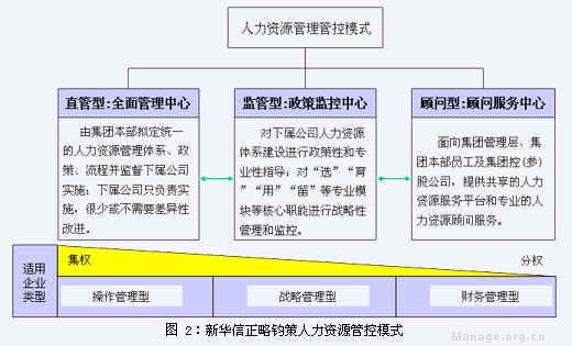 二、集团人力资源管理的功能定位和管控模式设计。根据新华信正略钧策多年管理咨询实践总结,集团化公司有三种人力资源职能定位:直管型、监管型和顾问型,相应的有三种管理模式,即全面管理中心、政策管理中心和顾问服务中心。(见图2)
