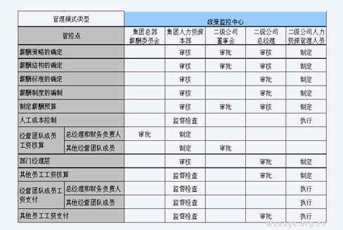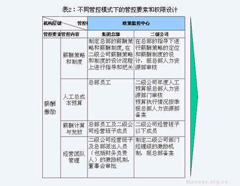 三、为便于企业的实践操作,在确定集团化公司的人力资源职能定位和人力资源管控模式后,需结合企业的实际情况,根据人力资源体系的招聘、考核、培训、薪酬等不同模块,设计不同职能定位下各层级人力资源管控要素和权限。(见表2)